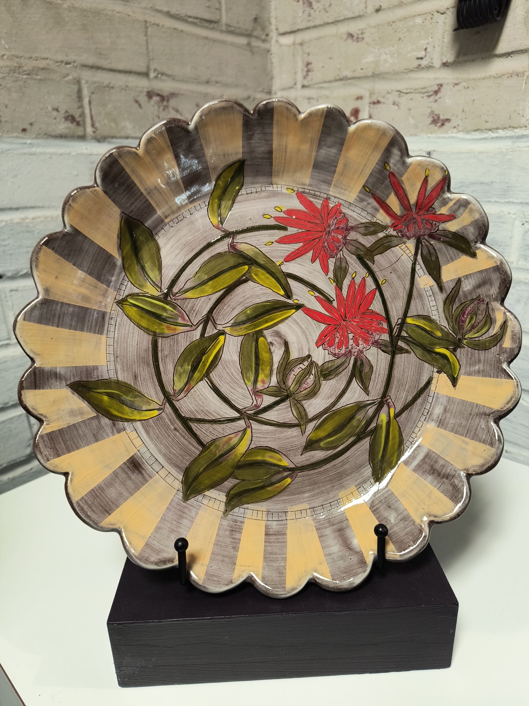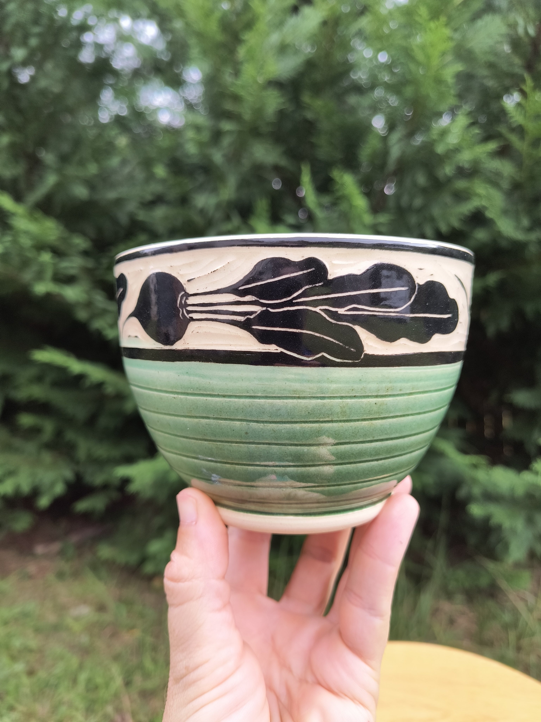 Rosa Friedrichs is a ceramic artist from Weaverville, NC. She makes functional pots decorated with sgraffito. Sgraffito is a decoration technique in which a top layer of slip is carved through to reveal the contrasting clay body beneath. The technique and visual product are similar to a linoleum or woodblock print. Rosa's motifs are inspired by flowers, vegetables and fruits. She enjoys both black and white sgraffito and colorful sgraffito. She hopes her imagery provokes positive feelings and memories and that her forms make their way into people's lives, infusing joy into their daily routines.